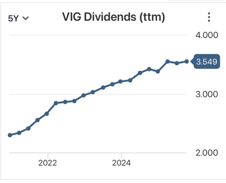 連続増配株を集めているだけあり、VIGは長期的に増配をしていますね。