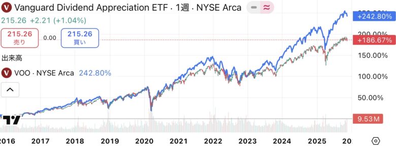 暴落耐性がありつつ、VOOに近いリターンを上げられるETFを求めるのであればVIGは選択の余地がある素晴らしいETFだと思います。