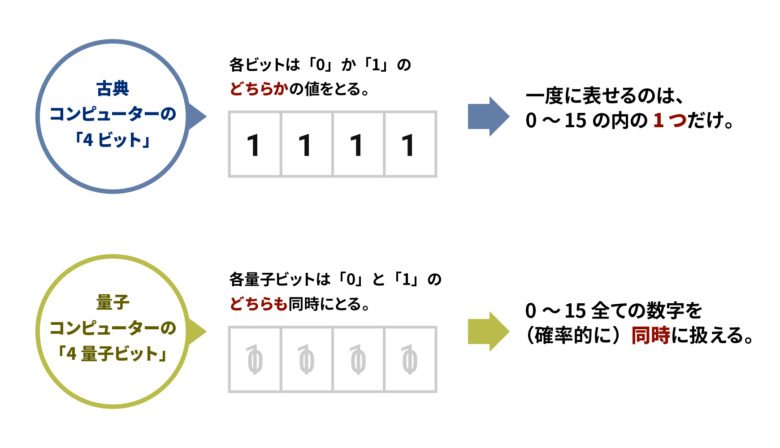 対して、量子コンピュータは「量子ビット」という特殊な性質を使います。これは「0でもあり、1でもある」という状態を同時に持てるため、「迷路のすべての道を、一気に調べて、一瞬で出口を見つける」ことができるのです。